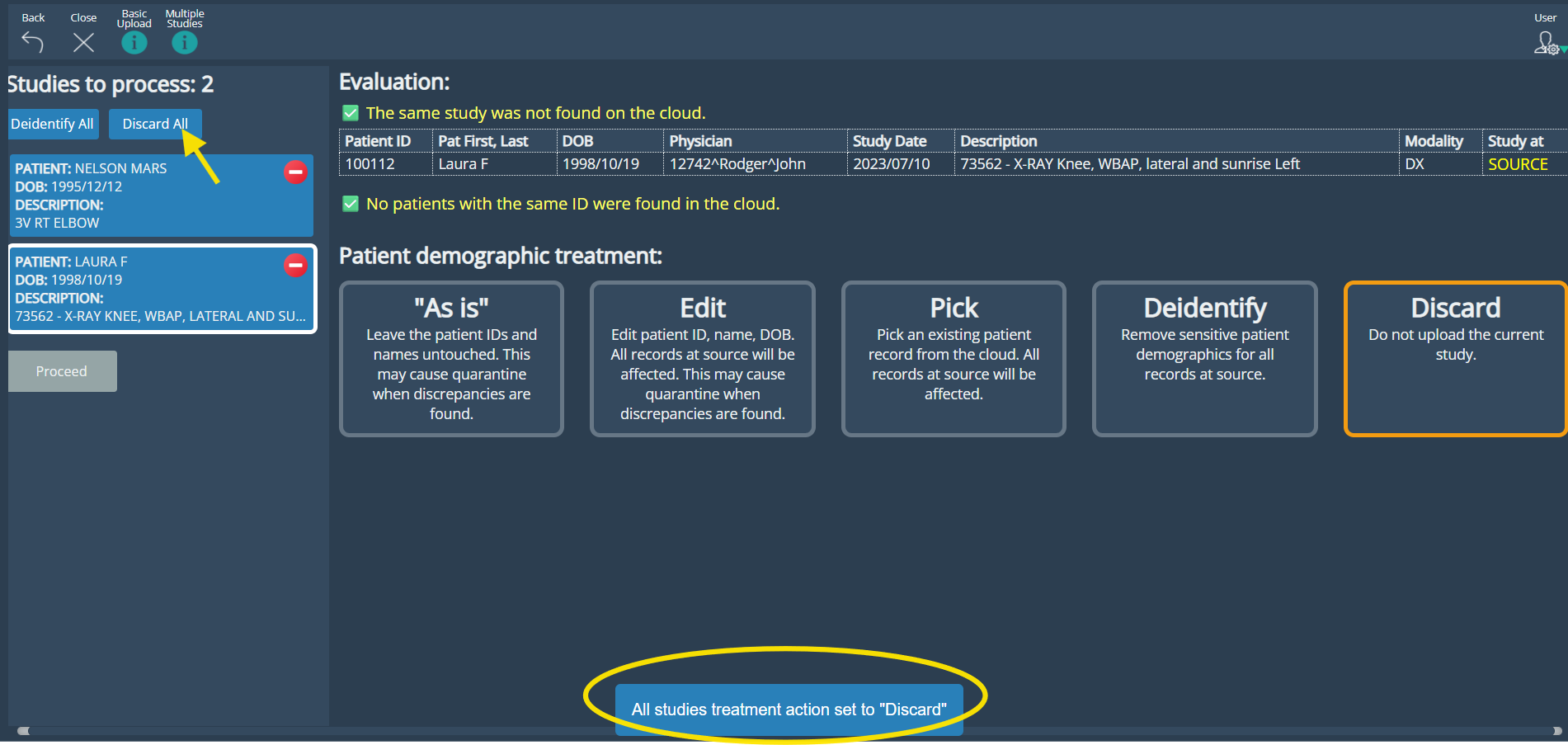 DISCARD: Exclude a study from the upload.