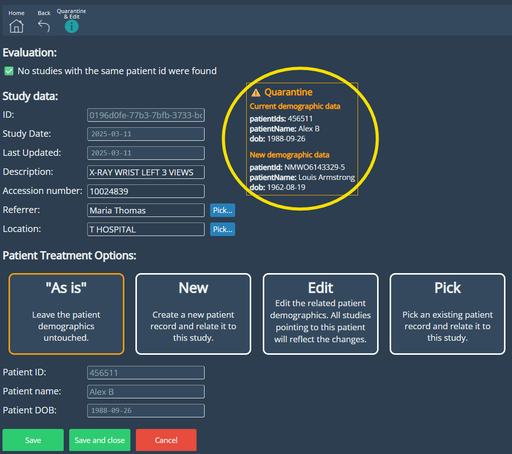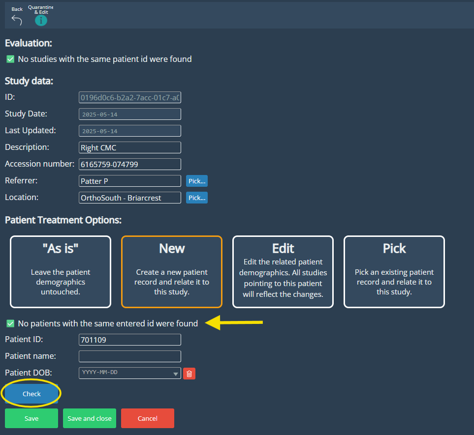Users can easily update study details and choose how to handle patient data using options like As Is, New, Edit, or Pick. The improved interface simplifies the process with a clearer layout and responsive guidance. When creating or editing a patient, the system automatically checks for existing records based on the entered Patient ID and notifies the user if a match is found, helping maintain data consistency and avoid duplicates.