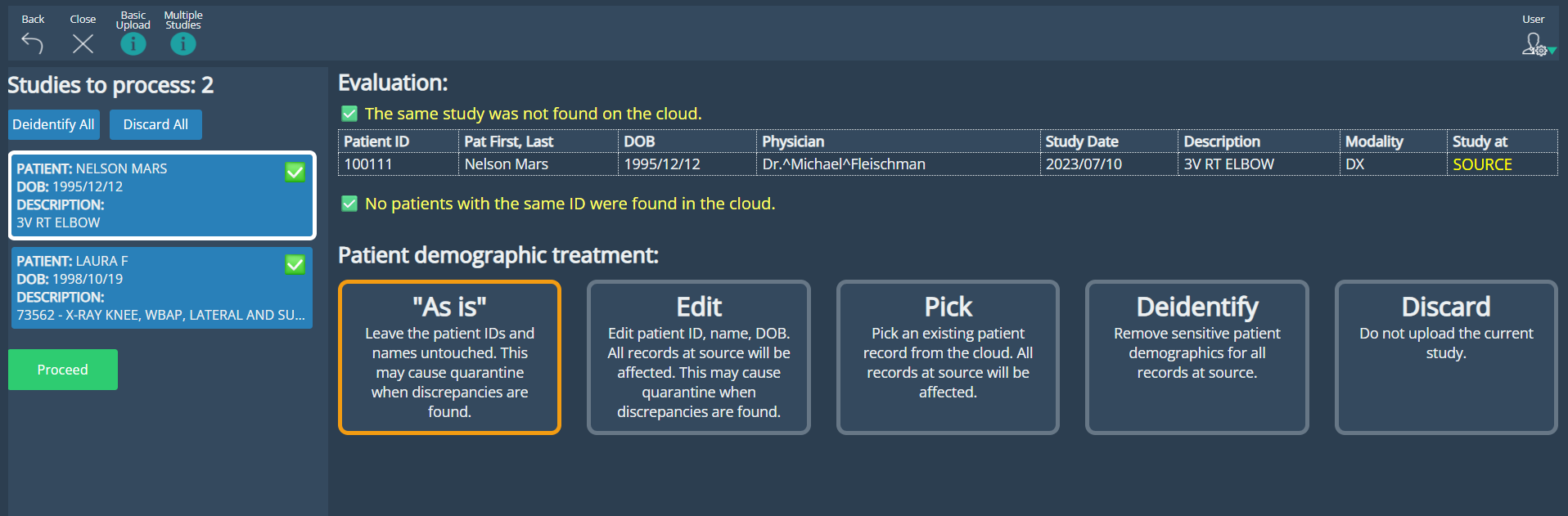 • UI Improvements: A redesigned interface that delivers a clearer, more efficient experience for managing studies. Each study is now presented as a selectable box, with detailed demographic and study data displayed clearly in structured tables upon selection, optimizing space and clarity. Users can apply actions such as AS IS, Edit, Pick, Deidentify, or Discard to individual studies, or perform bulk operations like Deidentify or Discard All.